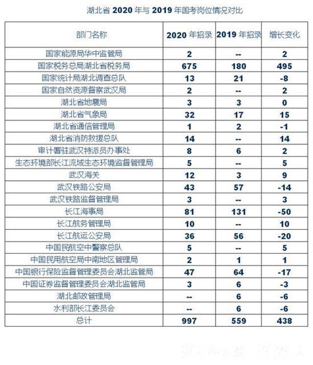 国家公务员局今天发布公告,中央机关及其直属机构2020年度考试录用公务员15日起开始报名。今日起,考生可查询招录职位信息。本次湖北省共招录635个岗位,共计997人,与去年(岗位370个,人数559人)相比大幅增长。