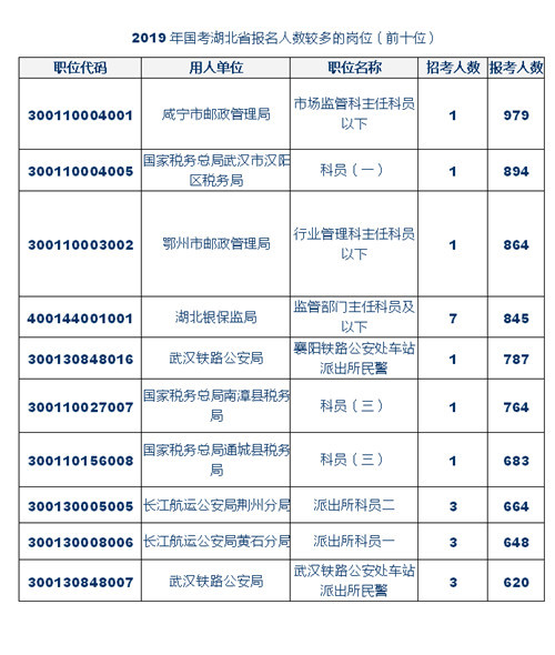 在湖北省的岗位中,招录人数增长最多的岗位是国家税务总局湖北省税务局,去年招录180人,今年招录675人,占到了湖北省招录人数总数的67.7%。专家建议,选择岗位尽量避免热门岗位,正所谓“考得好,不如报的好”,有的岗位竞争过于激烈,大大增加了录取难度。格木教育专家列出了2019年湖北岗位的十大热门岗位,供考生报名时参考,合理选择岗位。