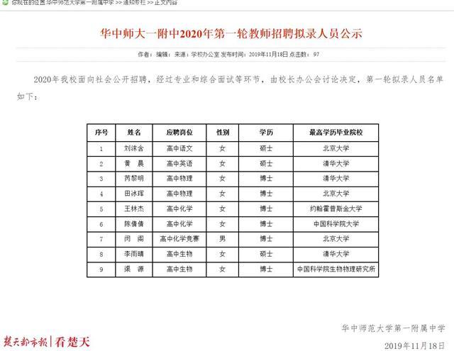 11月18日,华中师大一附中在学校官网上公布了该校2020年第一轮教师招聘拟录人员的公示名单,第一轮9名拟录人员中,6人是顶尖大学博士,其余3人也都是清华、北大的硕士,9人中清华、北大的毕业生就有6人。