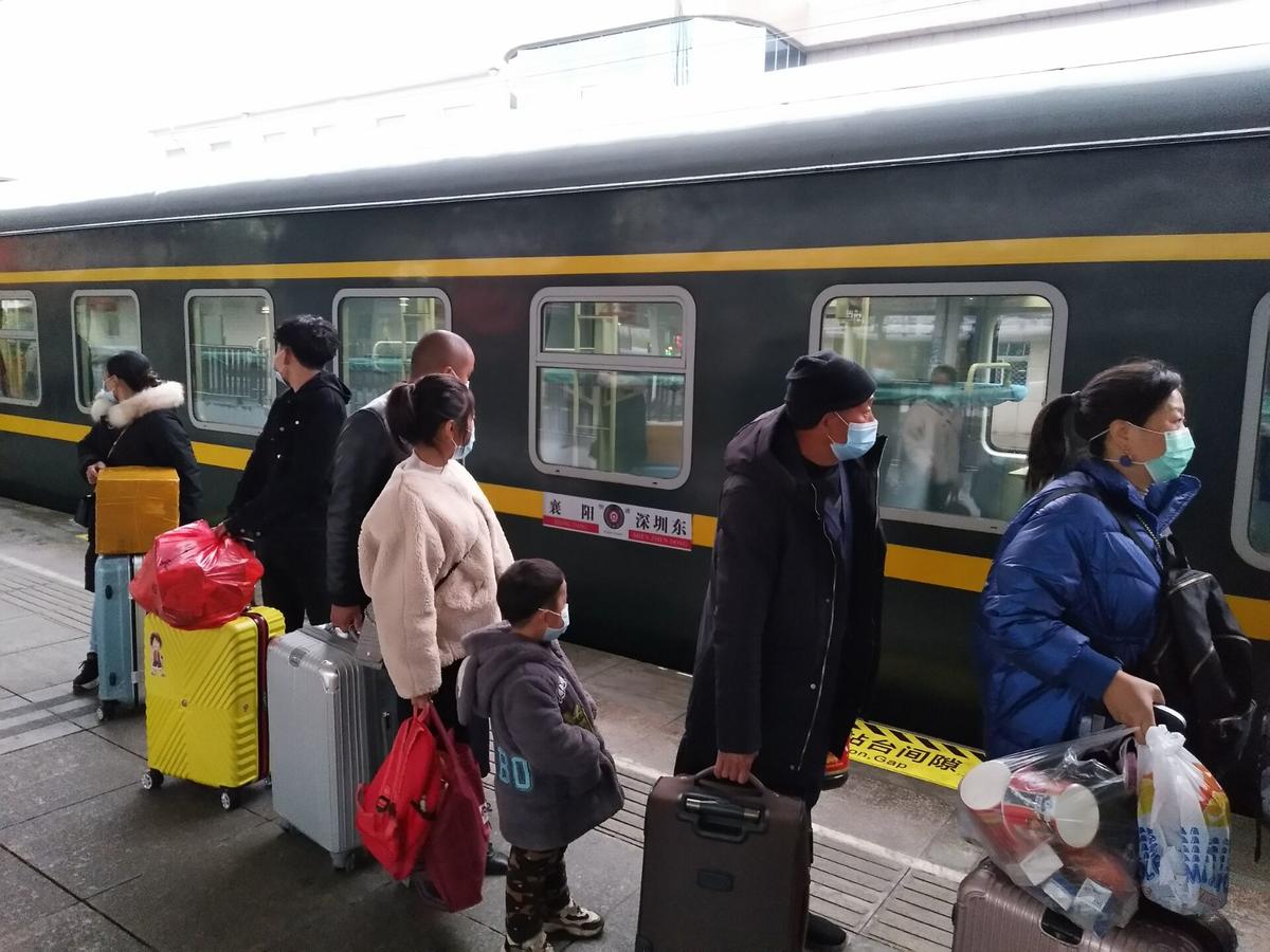 今天上午7时10分,一辆返岗专列从襄阳站始发,将一批襄阳籍务工人员送往惠州、东莞和深圳上班。
