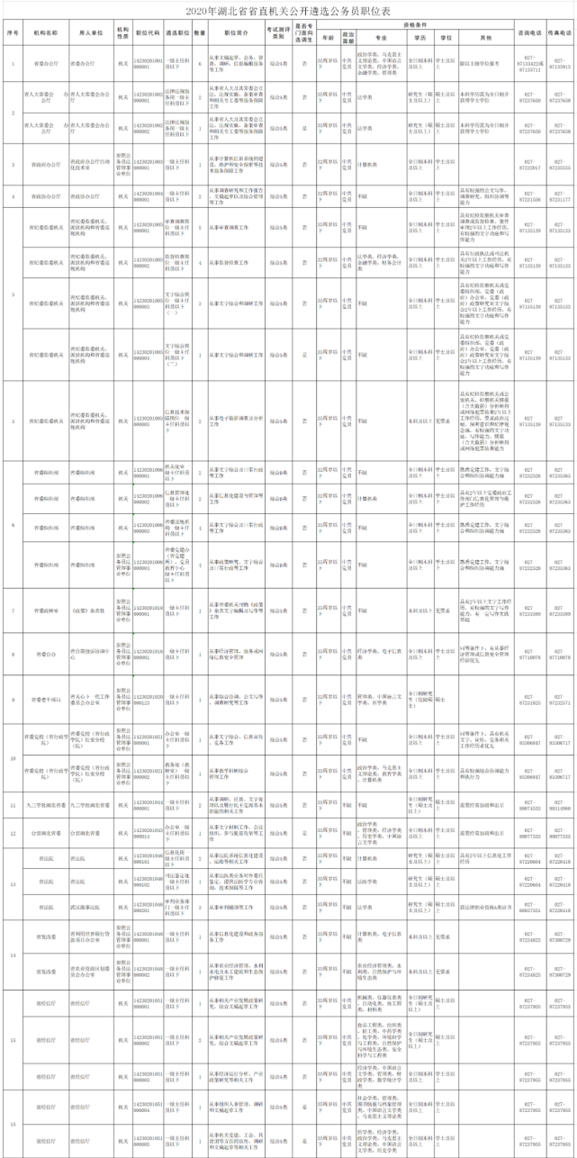 21家省直单位52个一级主任科员以下及相当层次职级职位共 97个计划,具体职位详见《2020年湖北省省直机关公开遴选公务员职位表》。其中,7 个职位 8个计划专门面向符合条件的选调生遴选。