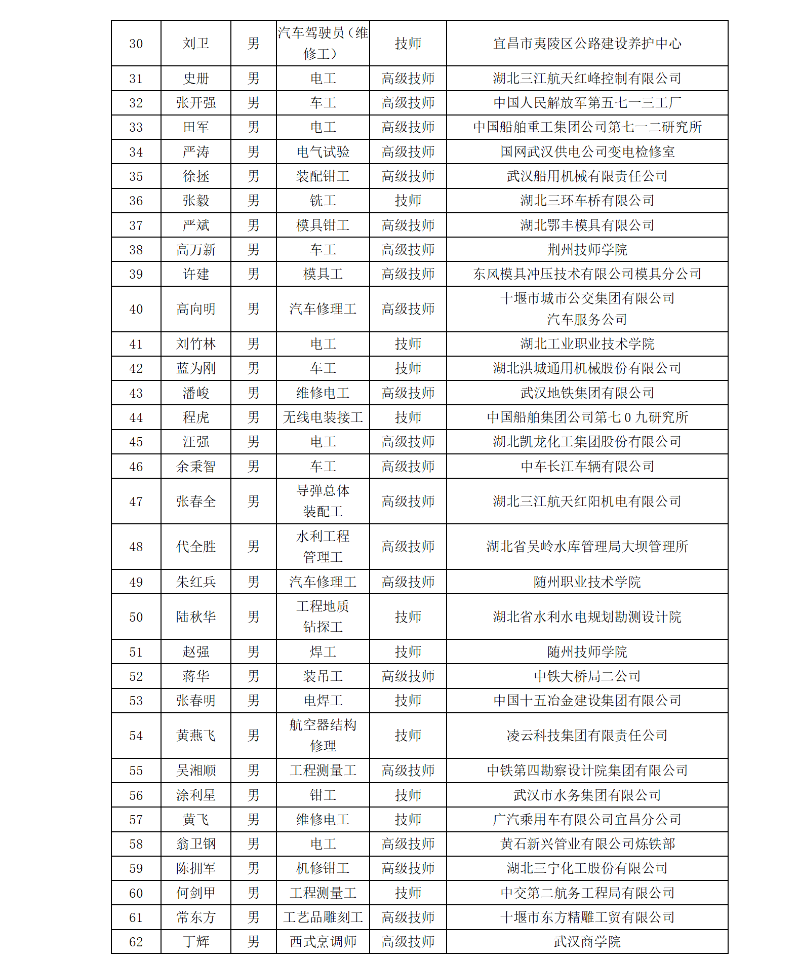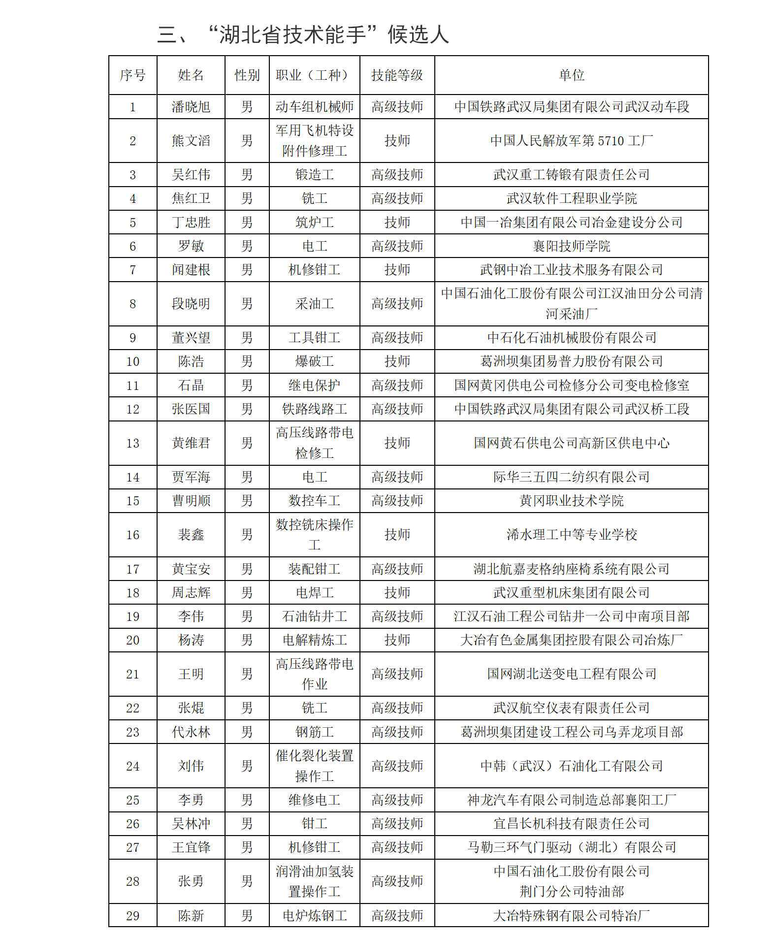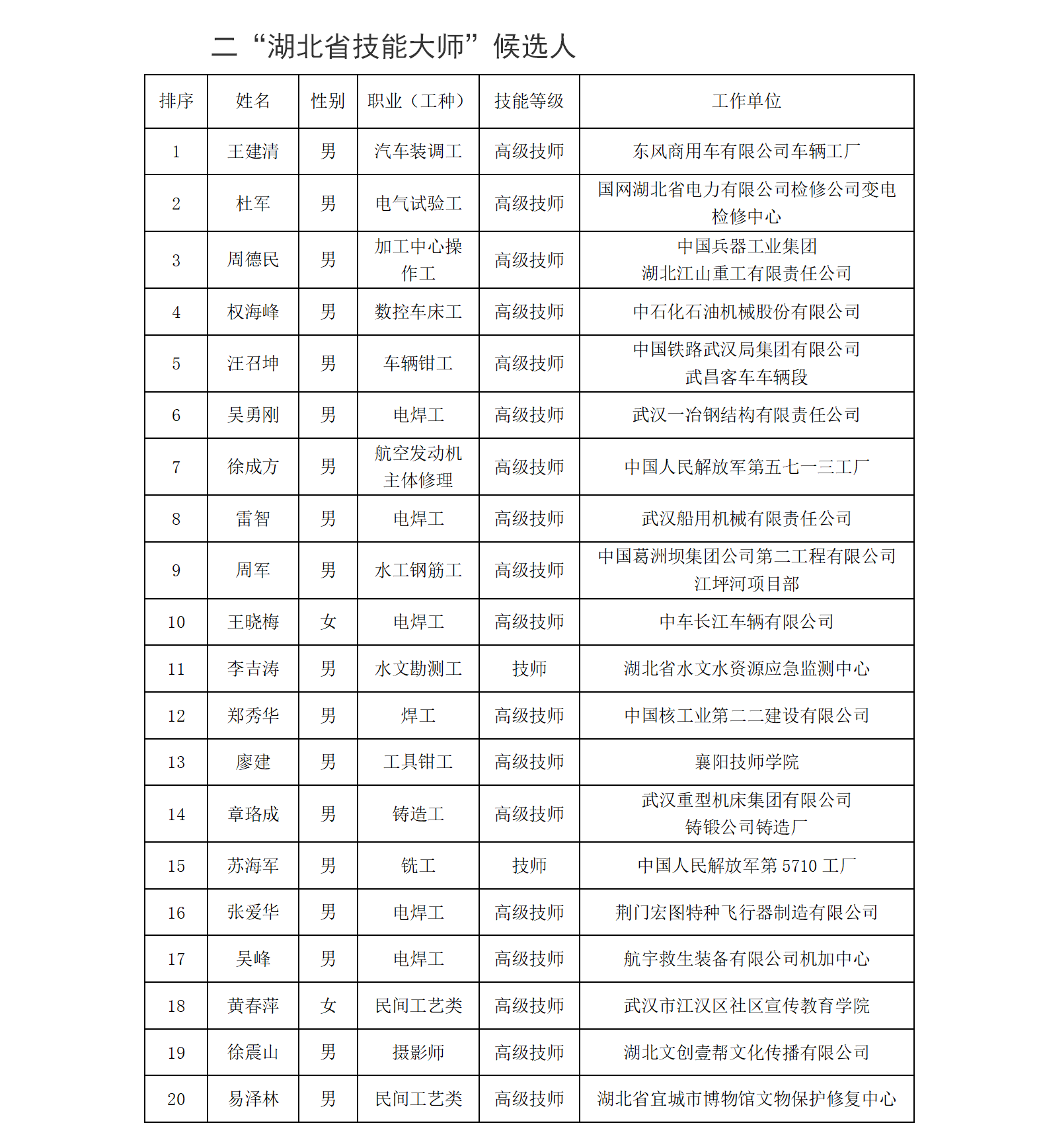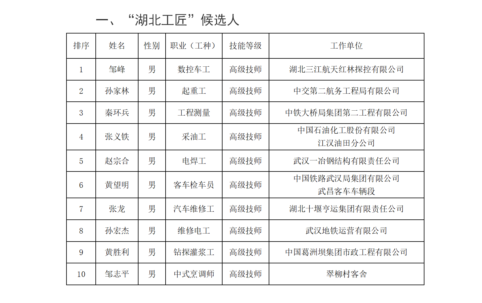 根据《省人力资源和社会保障厅关于开展湖北省第二届优秀技能人才选拔表彰工作的通知》(鄂人社奖〔2020〕11号)等文件精神,经单位推荐、专家评审等程序,拟确定邹峰等10人为“湖北工匠”候选人、王建清等20人为“湖北省技能大师”候选人、潘晓旭等70人为“湖北省技术能手”候选人。现将候选对象名单进行公示(名单附后),公示时间为5个工作日(2020年8月31日-9月4日)。