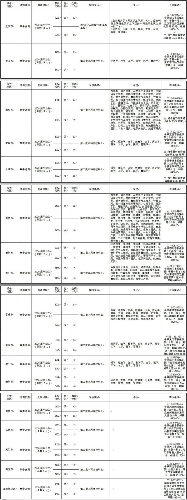 追加的400名专项招录计划,全部用于面向2020届湖北省内高校毕业生或湖北籍高校毕业生集中选调,分配到各市州(含直管市、神农架林区)的乡镇(街道)工作锻炼。具体情况详见《2020年湖北省选调生第二批招录职位计划表》。