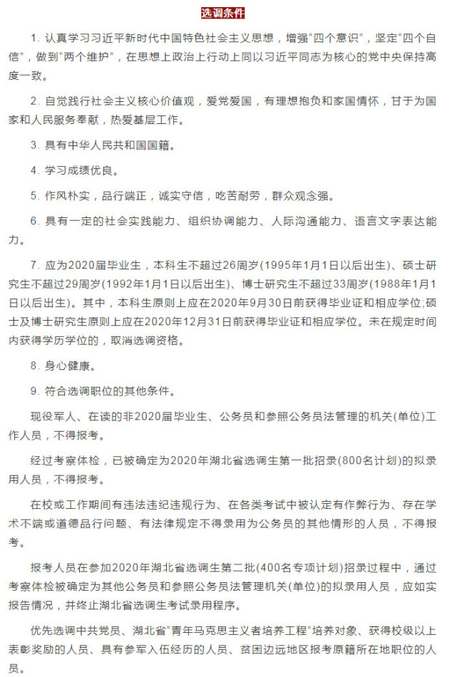 2020届湖北省内高校全日制大学本科及以上学历毕业生或湖北籍2020届全日制大学本科及以上学历毕业生,应为中共党员(含预备党员,下同),或具有一年以上学生干部经历,或被评为学校“三好学生”,或为湖北省“青年马克思主义者培养工程”培养对象。