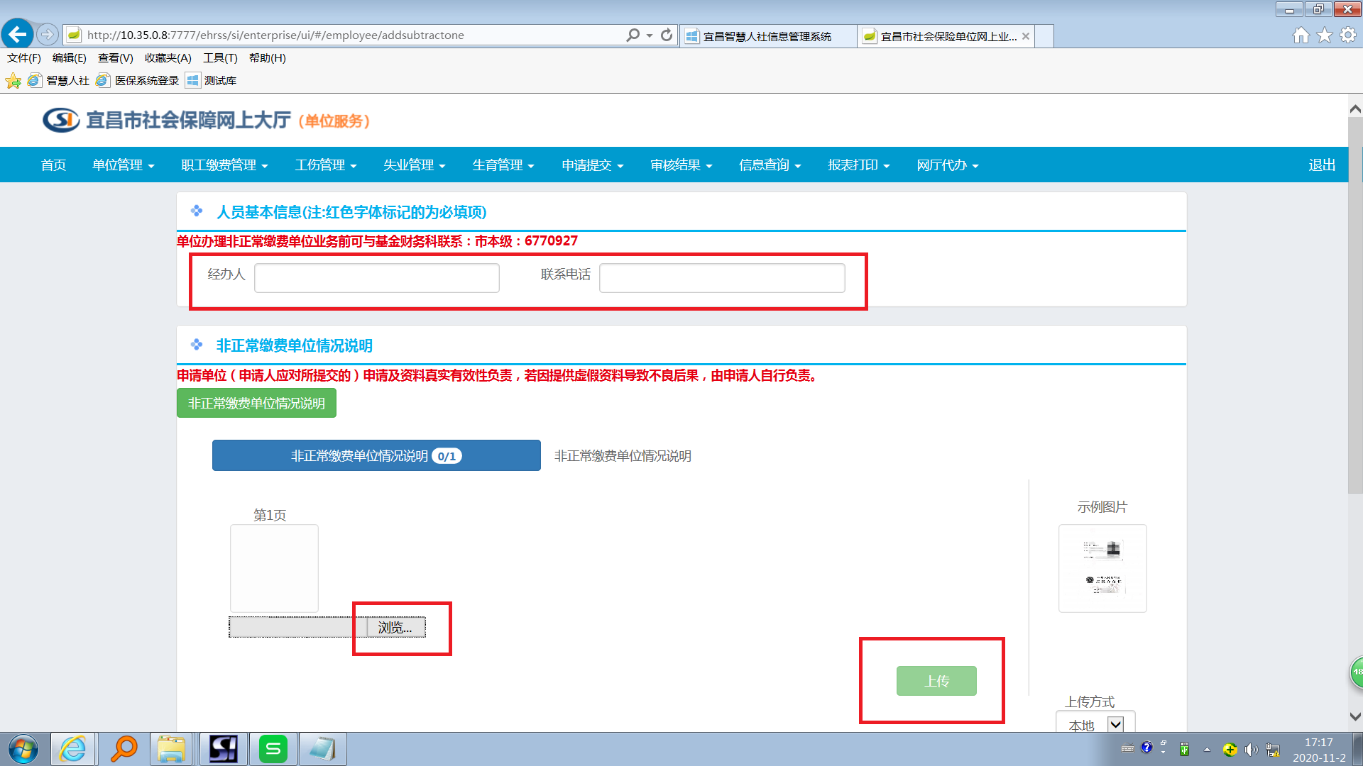 5.填写单位经办人以及联系电话,在页面点击“浏览”上传办理资料后,点击“上传”